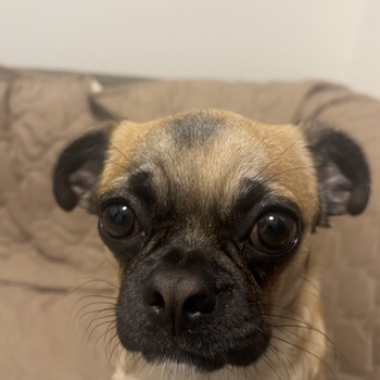 パグとチワワのミックスであり、毛色は茶色で顔の中心が黒く、耳は先が垂れております。
